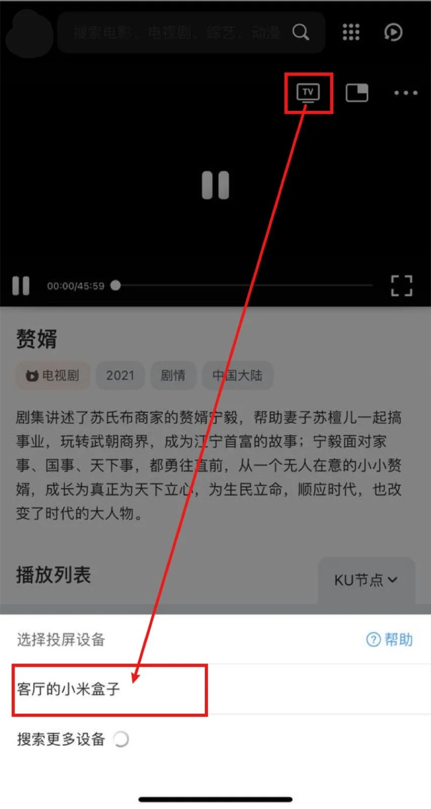 打开QQ浏览器(会接管网页播放器)->打开休闲一下->播放视频->选中投屏图标->等待搜寻出智能电视/电视盒子->选中,即可投屏。